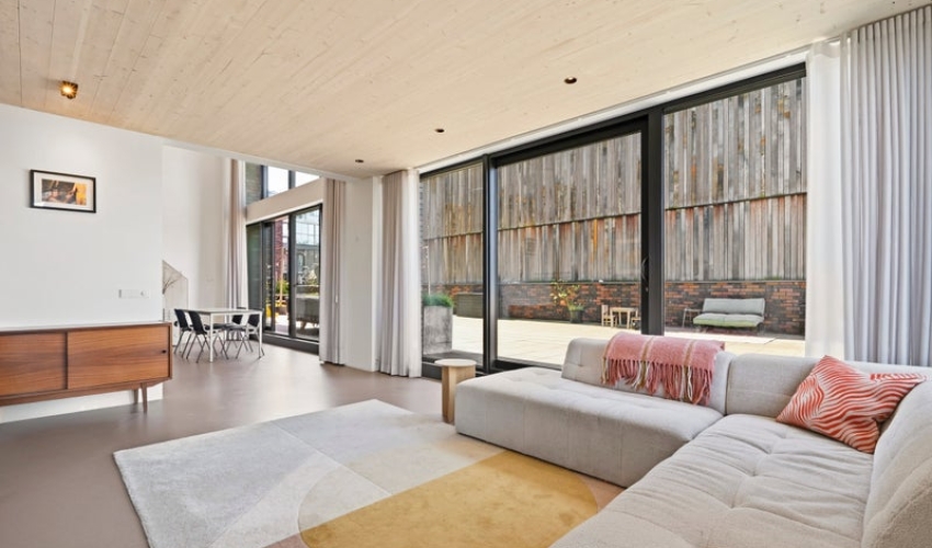 Unieke, zeer duurzame en lichte hoekwoning (150 m²) met loft-achtig karakter, hoge plafonds (5,3m²), privé parkeerplaats en een spectaculair dakterras (ca. 96 m²) op het zuiden met uitzicht over het IJ! Deze woning is te koop aangeboden door 020-Makelaars, een MVA Gecertificeerde Expat Makelaar. LOCATIE
