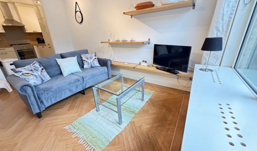 Lichte woonkamer met gloednieuwe vloer en zonnescherm