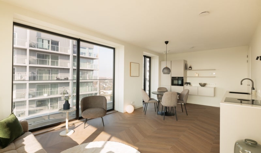 Wonen op de twaalfde verdieping met een spectaculair uitzicht over de stad! Op de twaalfde verdieping van The Starling ligt dit hoogwaardig afgewerkte en volledig gemeubileerde driekamerappartement. Dankzij de ligging op de hoek geniet je hier van een panoramisch uitzicht over de stad, met zicht op de Amstel en de skyline van Amsterdam. Via de gezamenlijke entree op de begane grond bereik je eenvoudig zowel de lift als het trappenhuis, die je naar de 12e verdieping brengen. De hal van het app...... Als je verder klikt kom je bij een nieuwe pagina met uitgebreide informatie over de huurwoning en met de directe contactgegevens van de beheerder