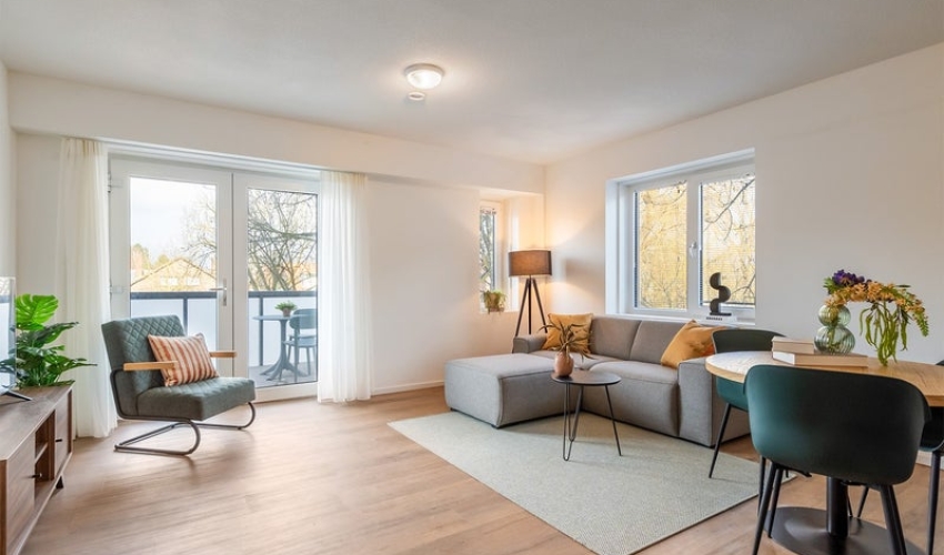 Via de gezamenlijke entree bereik je het app...... Als je verder klikt kom je bij een nieuwe pagina met uitgebreide informatie over de huurwoning en met de directe contactgegevens van de beheerder