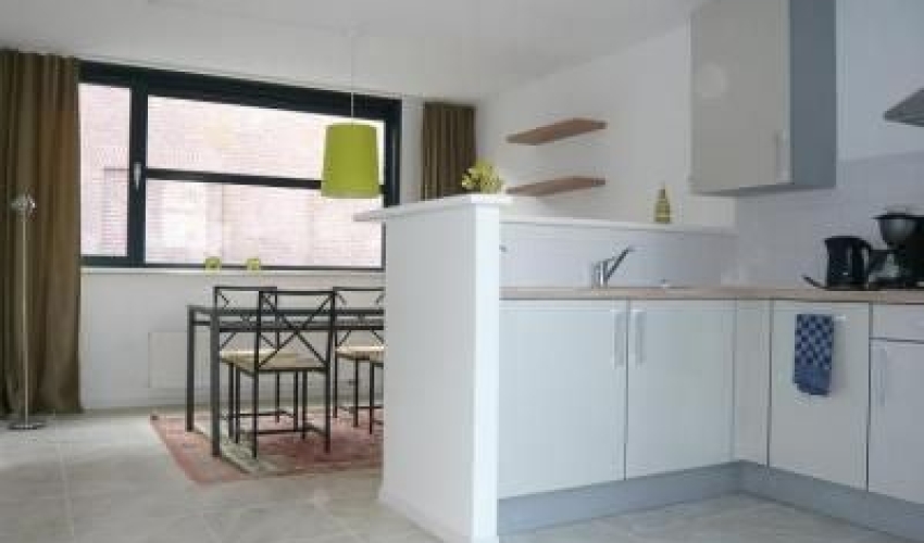 1e verdieping: lichte woonkamer van ca.24m² met terras, meubels, televisie, dvd, open keuken voorzien van alle apparatuur.