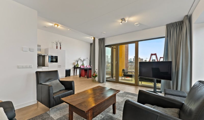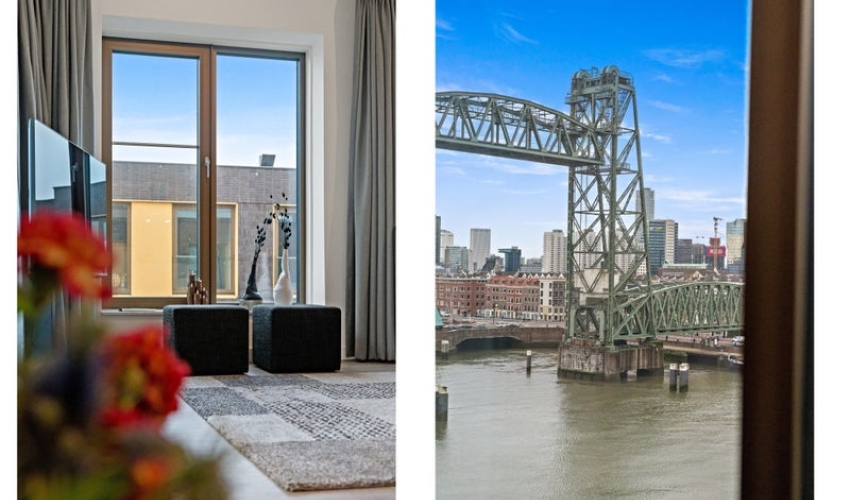 Op de zesde verdieping van dit moderne nieuwbouw complex aan het water bevindt zich dit sfeervolle en compleet gemeubileerde 3-kamerappartement. De woning valt op door het hoge plafond, een heerlijk terras met panoramisch uitzicht én een stijlvolle inrichting.Het uitzicht op onder andere de Willemsbrug, de Hef en de skyline van Rotterdam is werkelijk adembenemend. Of je nu binnen zit of buiten op het terras, je geniet hier elke dag van het mooiste wat de stad te bieden heeft. Je zit hier precie...... Als je verder klikt kom je bij een nieuwe pagina met uitgebreide informatie over de huurwoning en met de directe contactgegevens van de beheerder