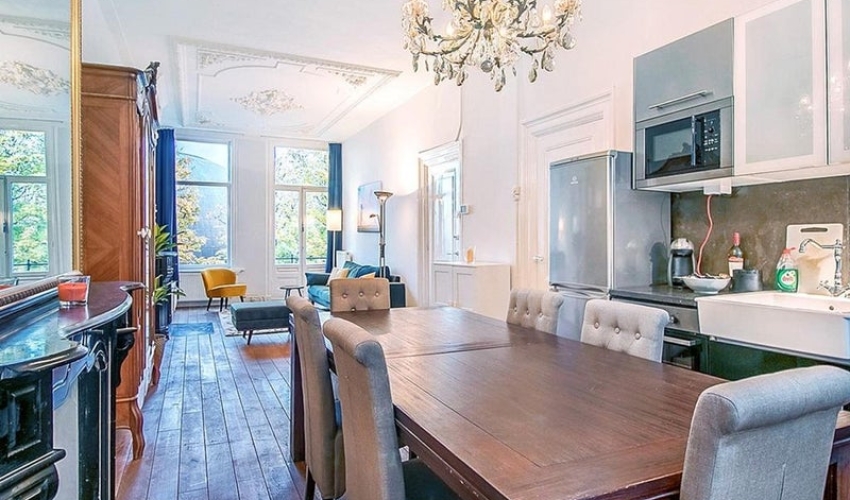 Plantage Kerklaan – Amsterdam Dit karaktervolle appartement is gelegen op de eerste verdieping van een monumentaal pand uit 1894 en kenmerkt zich door hoge plafonds van ca. 3,10 meter met authentieke ornamenten. De woning beschikt over een balkon aan de voorzijde en grote raampartijen die zorgen voor veel lichtinval. Zowel de voor- als achtergevel zijn voorzien van dubbele beglazing. Het appartement is gelegen in de Plantagebuurt, een van de meest rustige en groene delen van Amsterdam-Centrum....... Als je verder klikt kom je bij een nieuwe pagina met uitgebreide informatie over de huurwoning en met de directe contactgegevens van de beheerder