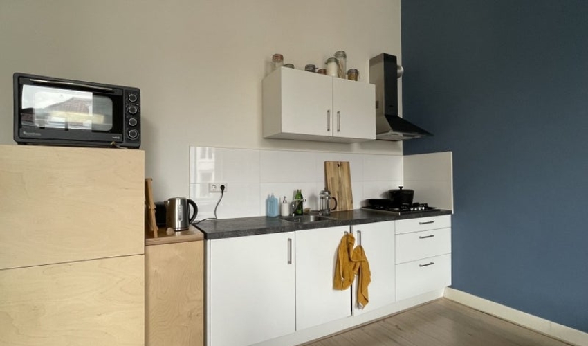 Op de hal van de etage, buiten de woning zelf, bevind zich je eigen toilet. Ook staat er een wasmachine voor gemeenschappelijk gebruik.