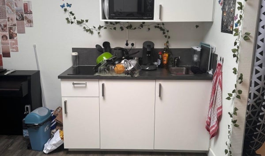 Gezamenlijke keuken, voorzien van een kookplaat, afzuigkap, koelkast, combi magnetron en vaatwasser.