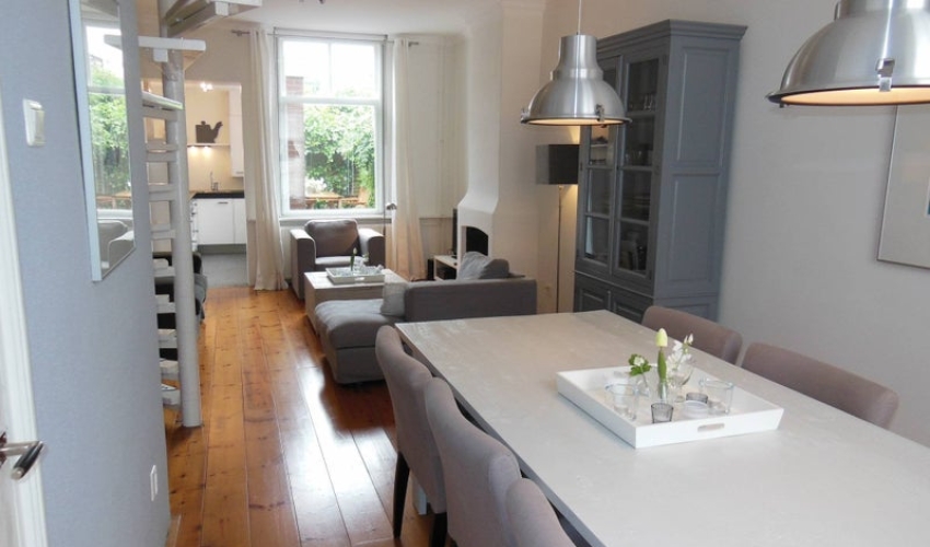 Lichte woonkamer met eetkamergedeelte, keuken met diverse apparatuur met toegang tot de knusse tuin. Eerste verdieping